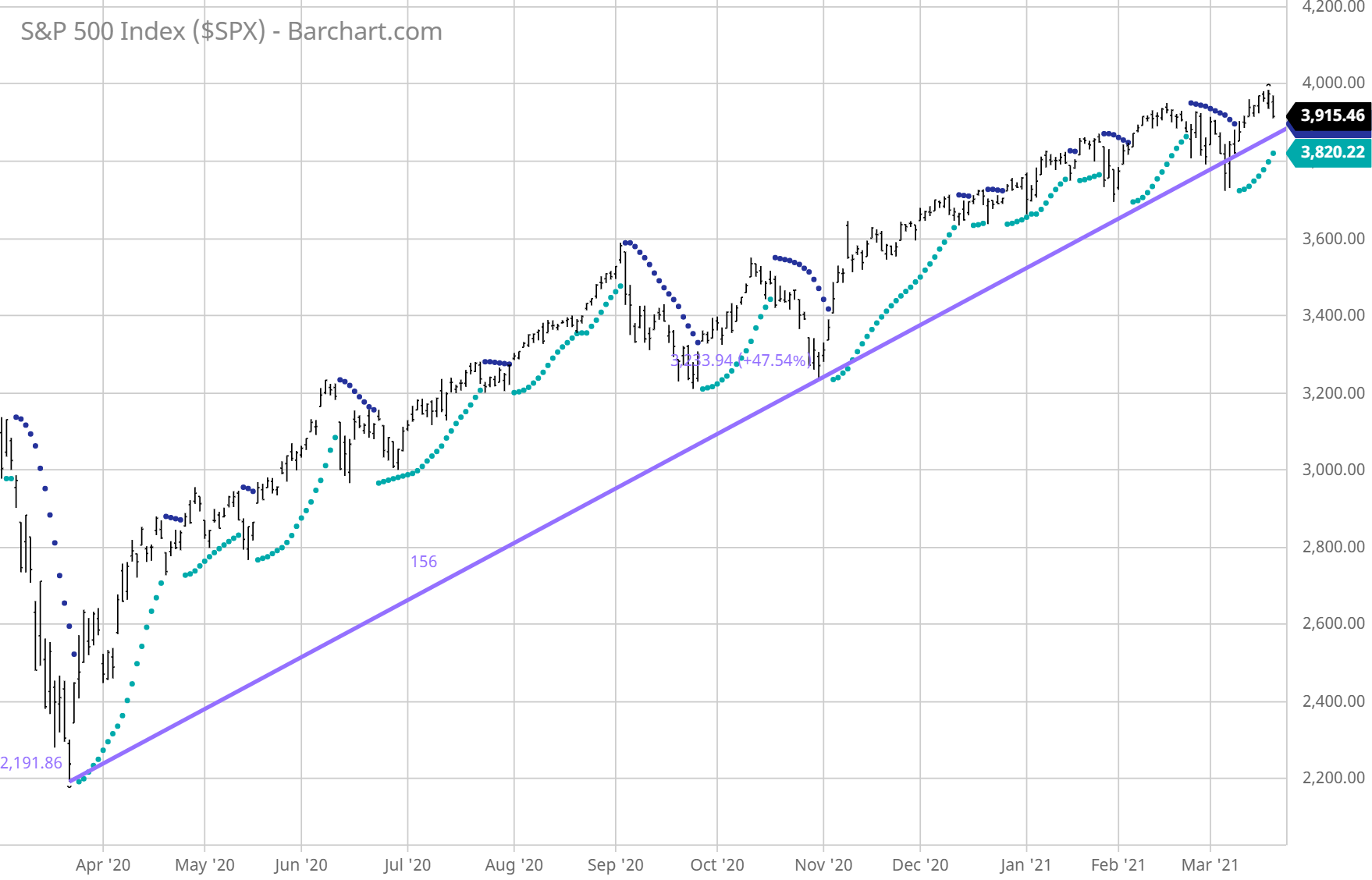 Untitled1 Following yesterday's sharp decline, the index and the Parabolic SAR indicator were both within 100 points of each other, at 3820 and 3915, respectively. Prior to the start of this week, I predicted that the index would oscillate between 3900 and 4000, giving the Parabolic SAR time to catch up. We'll have to wait and see what today brings. The index has maintained its position above the uptrend trendline that runs from the low of 3/23/2020 of 2191 to the low of 10/30/2020 of 3233. Is the current high of 3983 a turning point?
