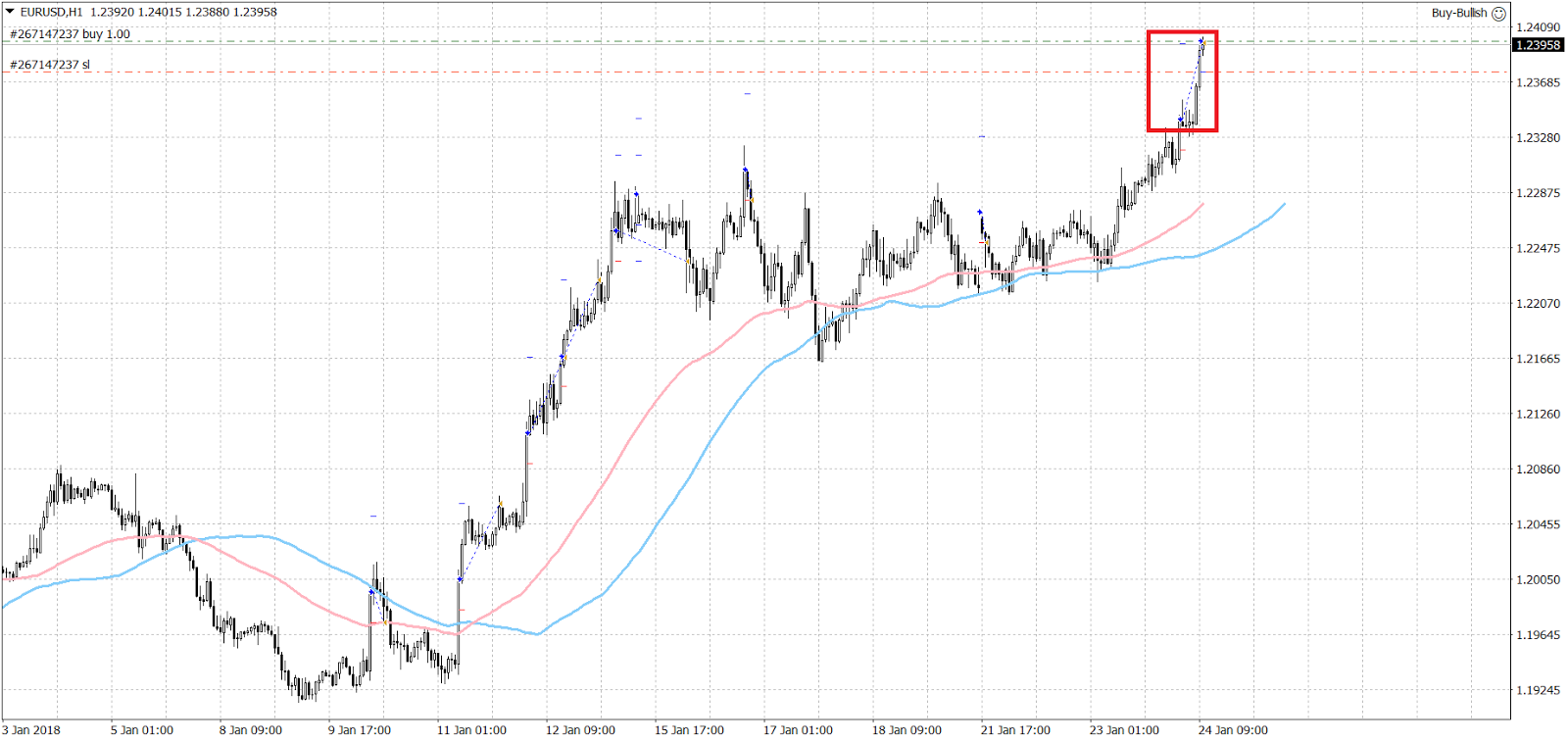 A buy position was opened from my MT4 EA after the euro broke above 1.2330. The position closed with a profit.